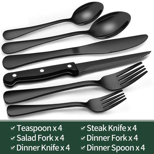 24 piece black silverware set, black dinnerware set for 4, food grade stainless steel flatware set